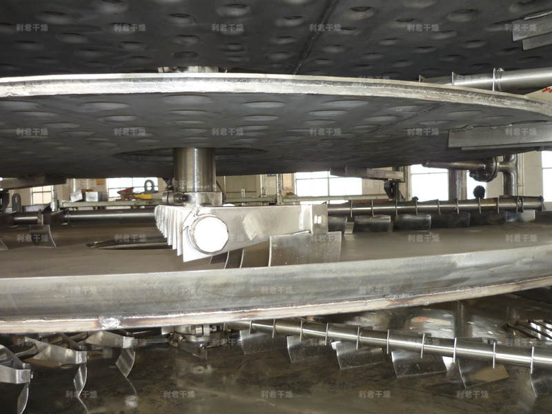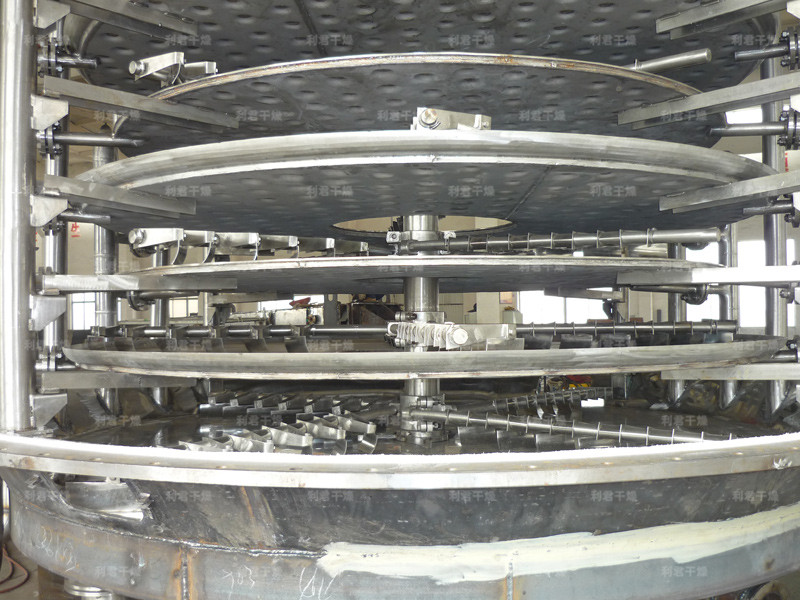 濕物料自加料器連續(xù)地加到干燥器上部第一層干燥盤上,帶有耙葉的耙臂作回轉(zhuǎn)運(yùn)動(dòng)使耙臂作回轉(zhuǎn)運(yùn)動(dòng)使耙葉連續(xù)地翻抄物料。物料沿指數(shù)螺旋線流過(guò)干燥盤表面,在小干燥盤上的物料被移送到外緣,并在外緣落到下方的大干燥盤外緣,在大干盤上物料向里移動(dòng)并從中間落料口落如下一層小干燥盤中。大小干燥盤上下交替排列,物料得以連續(xù)地流過(guò)整個(gè)干燥器。中空的干燥盤內(nèi)通入加熱介質(zhì),加熱介質(zhì)形式有飽和蒸汽、熱水和導(dǎo)熱油,加熱介質(zhì)由干燥盤的一端進(jìn)入,從另一端導(dǎo)出。已干物料從最后一層干燥盤落到殼體的底層,最后被耙葉移送到出料口排出。濕份從物料中逸出,由設(shè)在頂蓋上的排濕口排出,真空型盤式干燥器的濕氣由設(shè)在頂蓋上的真空泵口排出。從底層排出的干物料可直接包裝。通過(guò)配加翅片加熱器、溶劑回收冷凝器、袋式除塵器、干料返混機(jī)構(gòu)、引風(fēng)機(jī)等輔機(jī),可提高其干燥的生產(chǎn)能力,干燥膏糊狀和熱敏性物 料,可方便地回收溶劑,并能進(jìn)行熱解和反應(yīng)操作。