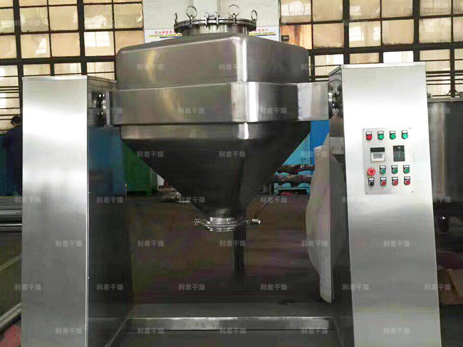 將物料裝入方錐形密閉混合桶內(nèi),料斗對(duì)稱(chēng)的軸線(xiàn)與回轉(zhuǎn)軸軸線(xiàn)成一夾角,不同組分物料在密閉的料斗中進(jìn)行三維空間運(yùn)動(dòng),產(chǎn)生強(qiáng)烈翻轉(zhuǎn)和擴(kuò)散收縮作用,達(dá)到理想的混合效果。